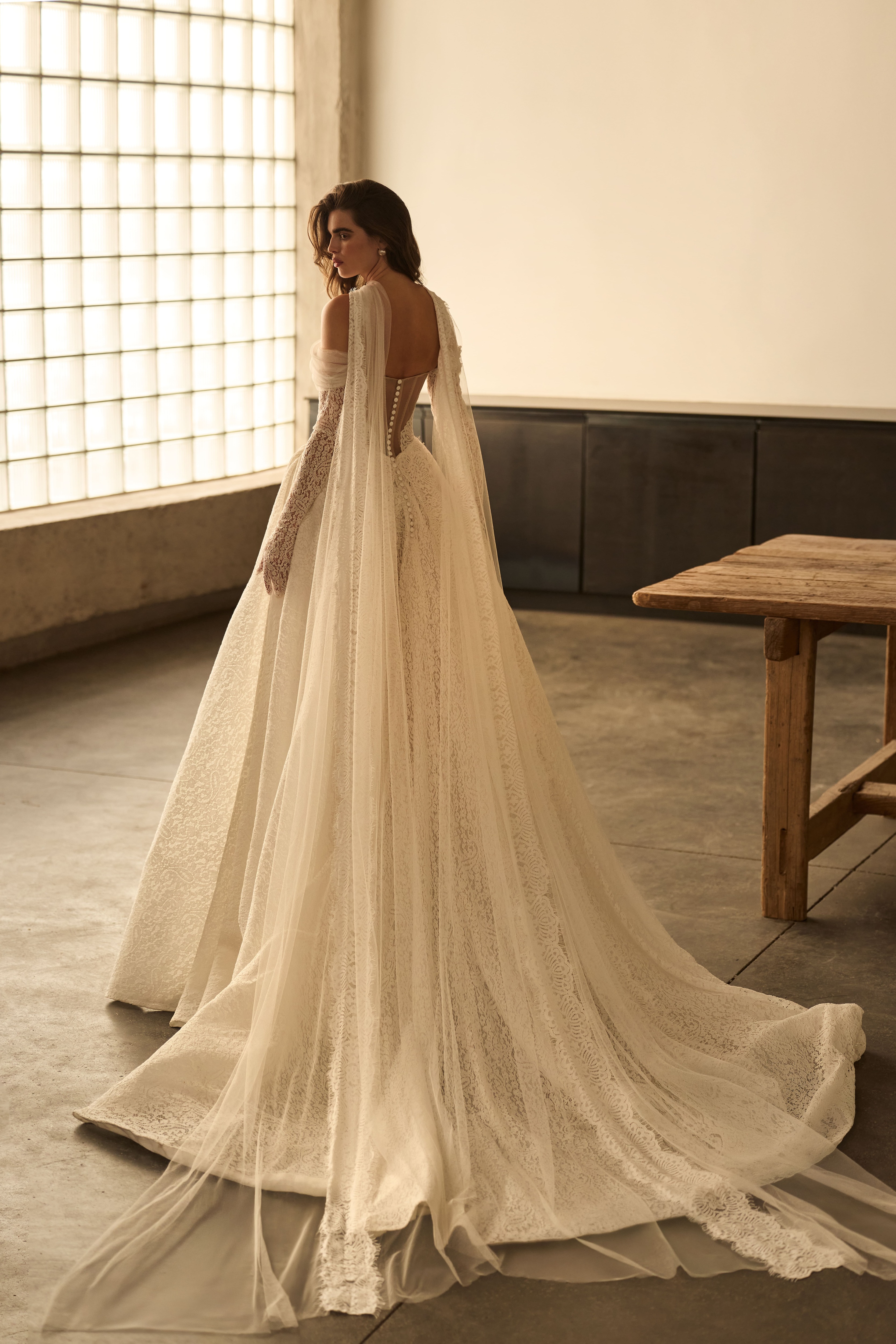 Lady Di by Milla Nova Atelier is a breathtaking lace ballgown designed for a grand, romantic statement. Its voluminous silhouette creates dramatic presence, while delicate tulle off-shoulder straps add softness and femininity. A row of buttons cascading down the train completes the look with timeless elegance and regal charm. Optional lace gloves give a dramatic and old-world feel. A true masterpiece!