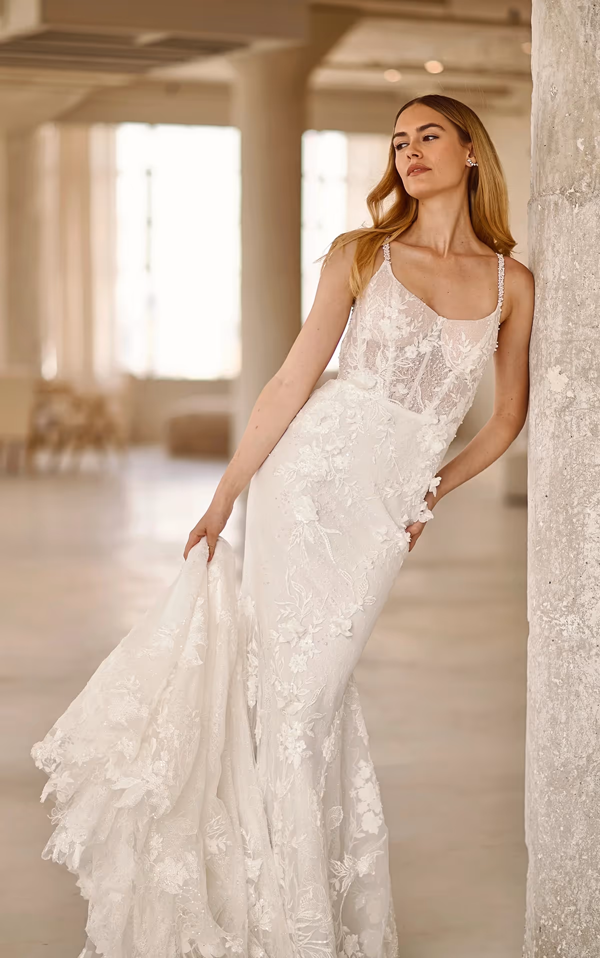 LE1226 is an allover lace column gown with pearl straps to meet a scooped neckline. With contoured seaming and exposed boning, the bodice’s corset look adds a modern alluring touch. The stunning open back detail features pearl-studded illusion tulle with delicate lace appliqué that connects to the softly ruched hip for that form-hugging sheath silhouette. A long cathedral lace train cascades from the hip.