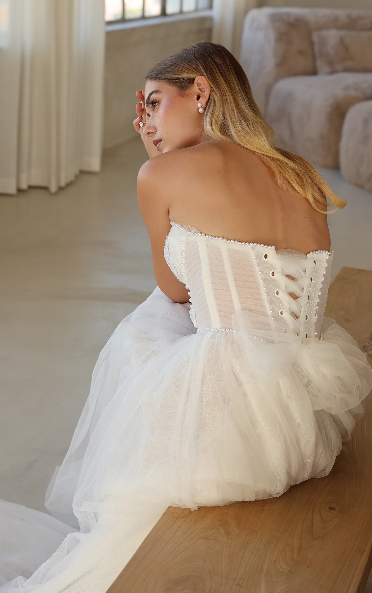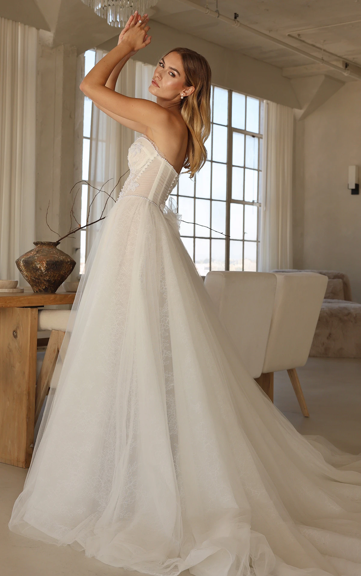 This designer A-line wedding dress has a stunning strapless sweetheart neckline adorned with tulle frill and pearl beading. The sheer corset bodice features handcrafted couture details like pearl-embellished floral lace appliqués and ruched tulle, while a pearl-framed lace-up back adds timeless elegance. From the waist, the dreamy A-line skirt flows in luxurious sheer tulle, revealing an elegant floral lace beneath, while a high leg slit adds a modern touch to this boho princess wedding gown.