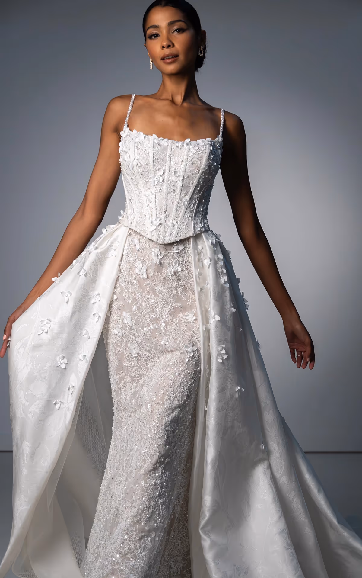 Radiating romance and high-fashion allure, Style LE1389 by Martina Liana Luxe is a stunning lace column wedding dress that makes a dramatic statement down the aisle. Exquisite floral lace adorns the entire gown, embellished with handcrafted sequins, beads, and 3D florals for a luxurious shimmer that catches every ray of light. Pearl-beaded spaghetti straps meet a modern square neckline, leading to a corset-fit bodice with exposed boning that accentuates the natural figure, as a timeless lace-up detail completes the bodice in the back. From the Basque waist, a fitted column skirt glides across the figure in a sparkling display of artisanal details, with an optional detachable overskirt in chic floral jacquard and scattered with 3D florals to transform this sexy column wedding gown into a dramatic statement piece.