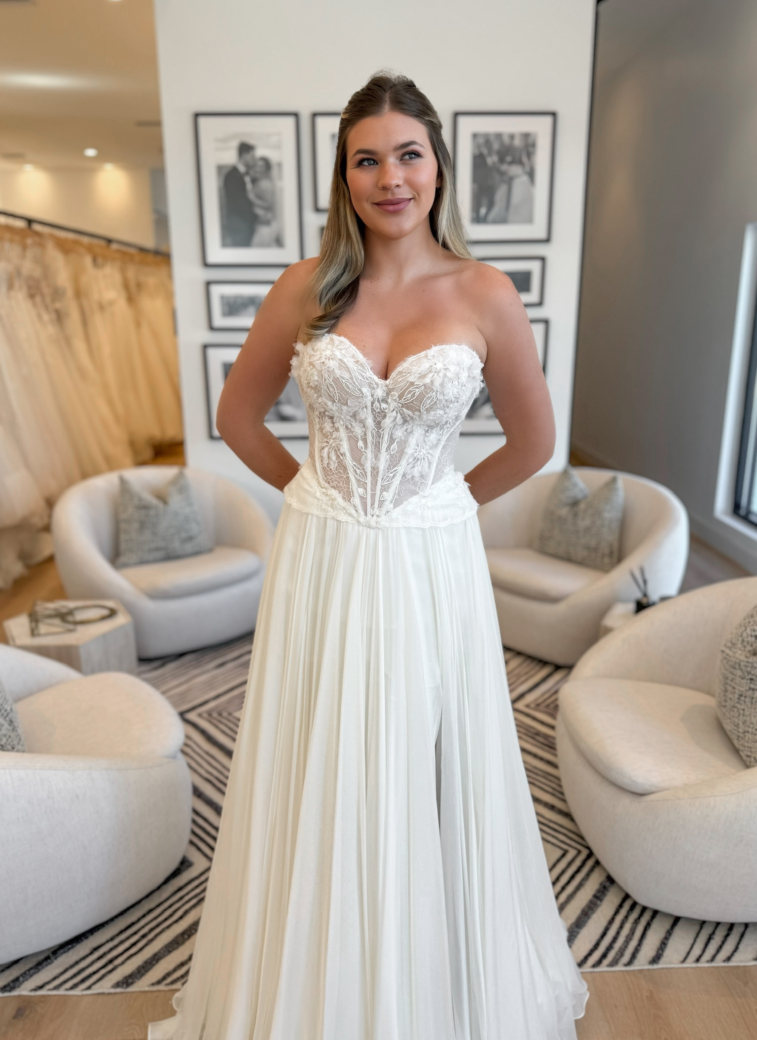 This sexy A-line wedding gown blends classic romance and high-fashion flair. LE1401 features a sheer strapless sweetheart bustier, its corset fit accentuated by exposed boning and adorned with matte lace and 3D florals. A contemporary lace peplum at the Basque waist adds a chic touch. Detachable off-the-shoulder long lace sleeves offer versatility to this sexy bridal look, embellished with feathery 3D floral at the shoulder and wrist. A dreamy A-line skirt flows from a Basque waist, where gathered layers cascade, parting at the thigh to reveal a daring high leg slit.