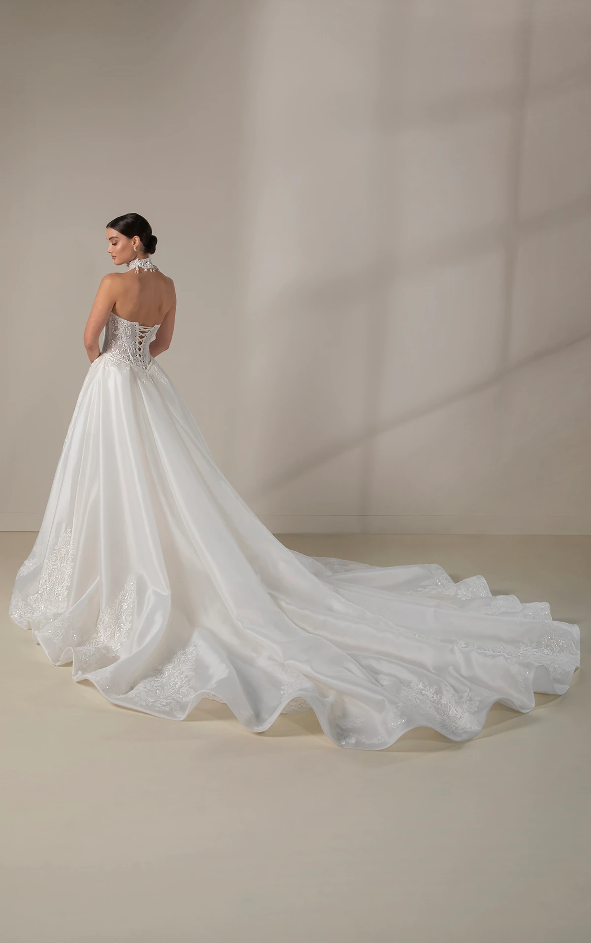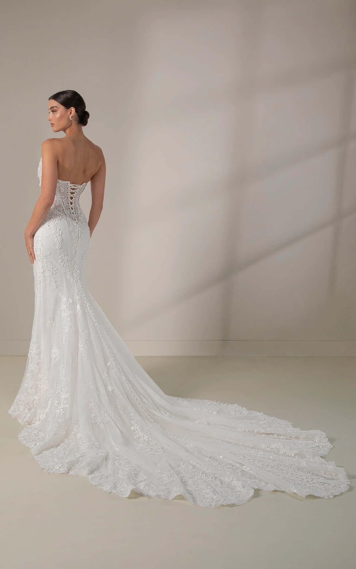 LE1415 is a handcrafted, luxury wedding dress that combines modern chic with timeless romance. A draped strapless bodice scoops at the neckline, transitioning into a stunning sheer corset adorned with intricate lace appliqués and dangling pearl beads. The basque waistline enhances the natural hourglass shape, while the fit-and-flare silhouette hugs the figure before flaring gracefully past the hips. A detailed lace train extends behind, and a detachable overskirt, trimmed with sparkling lace appliqués, adds volume and length to the modern romantic train. For the modern princess bride, this lace fit-and-flare wedding dress brings stylish opulence to every step down the aisle.