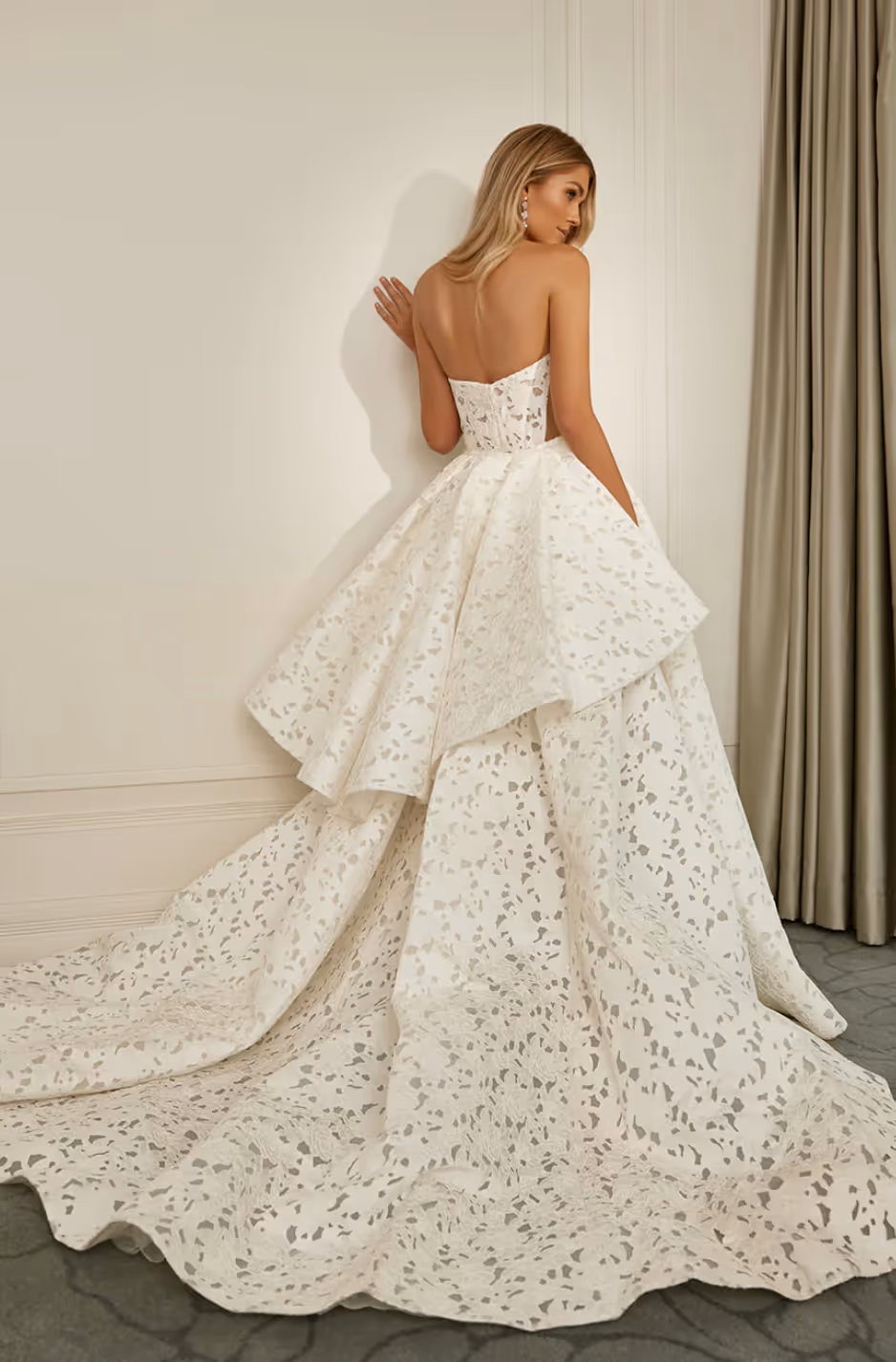 Lucia features a classic and simple design. The innovative fabric boasts laser-engraved satin, offering a distinct alternative to traditional satin or jacquard fabrics. This unique feature can serve as an effective store display to attract more brides. Additionally, the inclusion of detachable embellishments enhances the wedding dress's uniqueness.