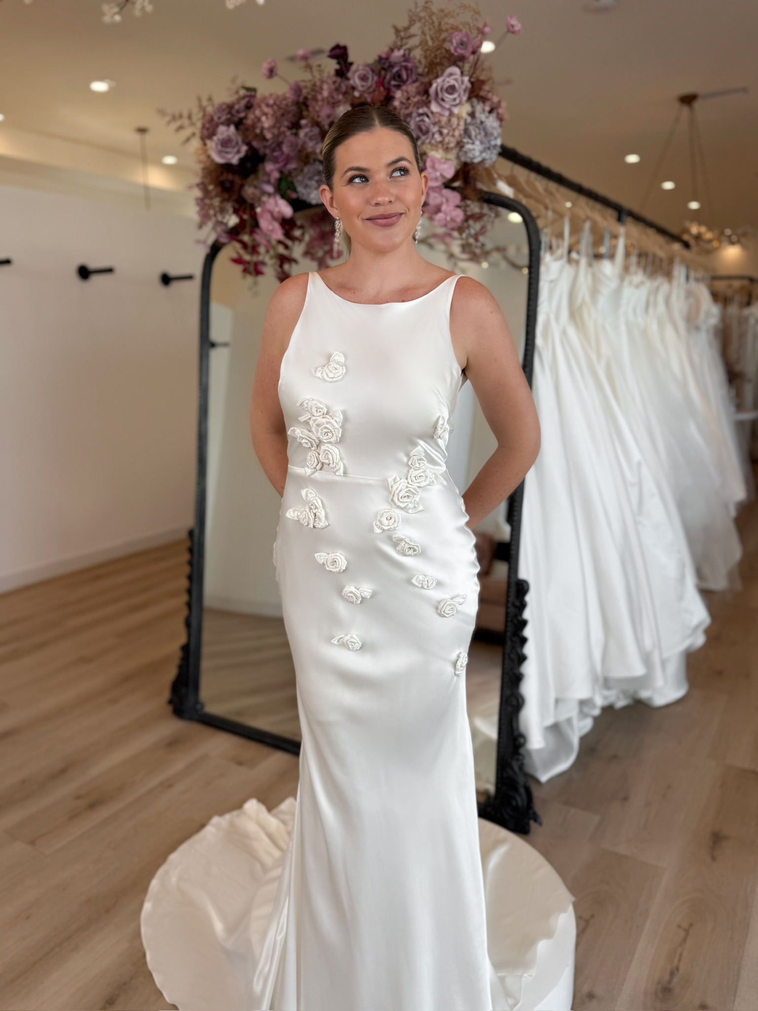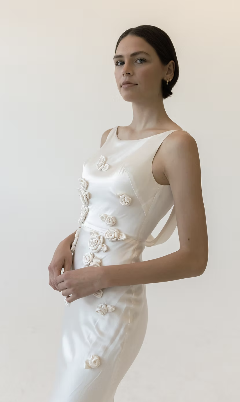 The Margot slip gown is crafted from a luxurious silk-satin blend, offering a sleek, figure-skimming silhouette. Delicate rosettes are artfully scattered across the bodice and skirt, adding romantic texture. A soft cowl back completes the look with effortless elegance.