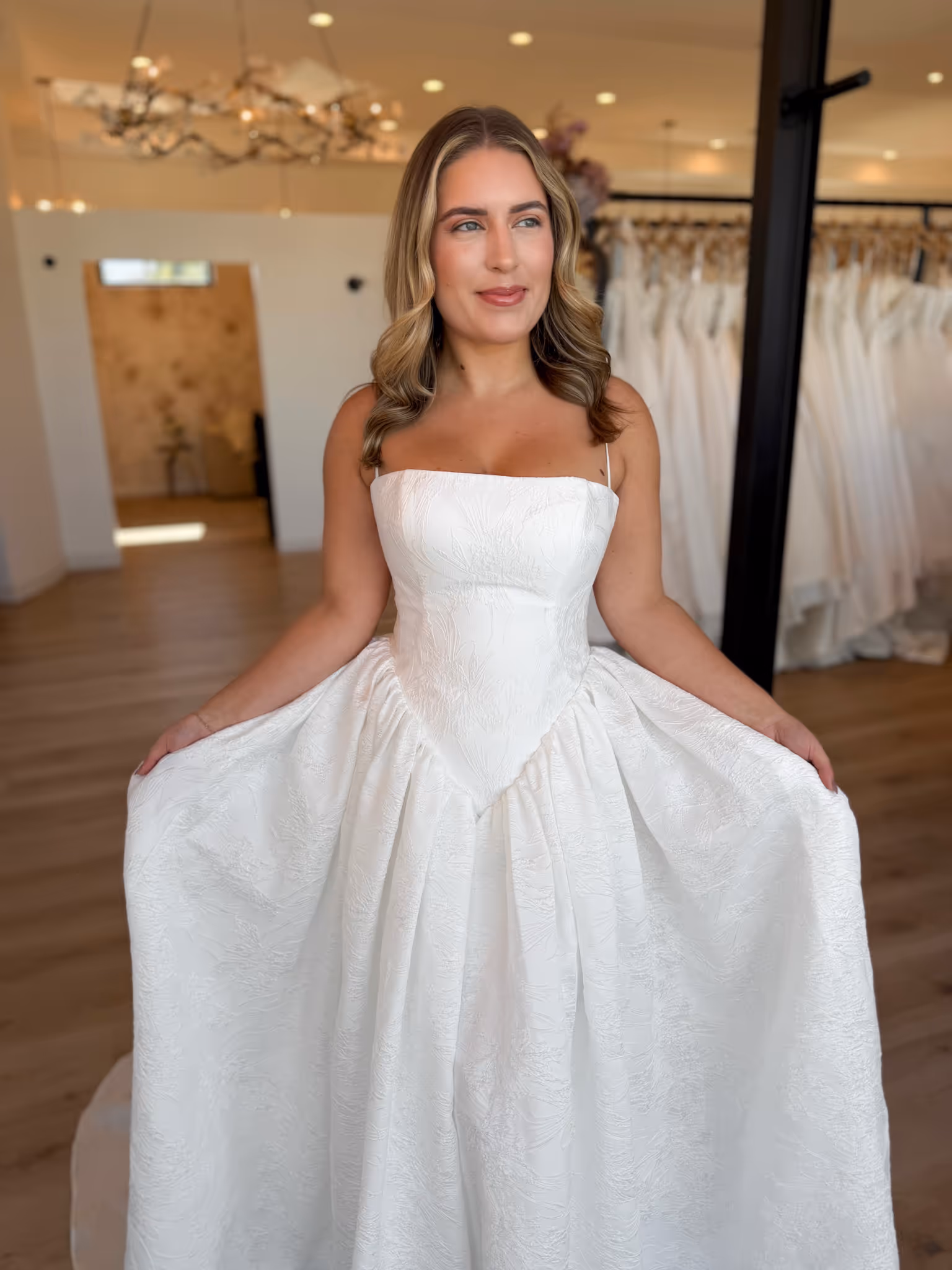 ML1998, a regal A-line bridal gown crafted in rich Organdy Jacquard or Silk Zibeline. The straight-across neckline is framed by delicate spaghetti straps, while the deep basque waistline sculpts the bodice into a flattering elongated silhouette. From there, dramatic hip volume creates a striking couture effect before unfolding into a full A-line skirt, its rich structure designed to captivate with every movement. Flowing into a sweeping train, this gown balances elegance and grandeur for the bride who dreams of making a statement in classic yet fashion-forward style.