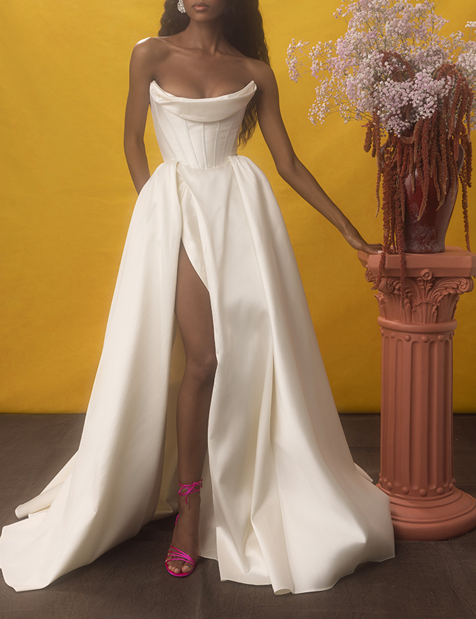 Modern elegance with a bold edge—Morrison features a strapless boned corset bodice, sleek A‑line silhouette, and subtle thigh‑high slit—all cut in luxurious satin for maximum impact.