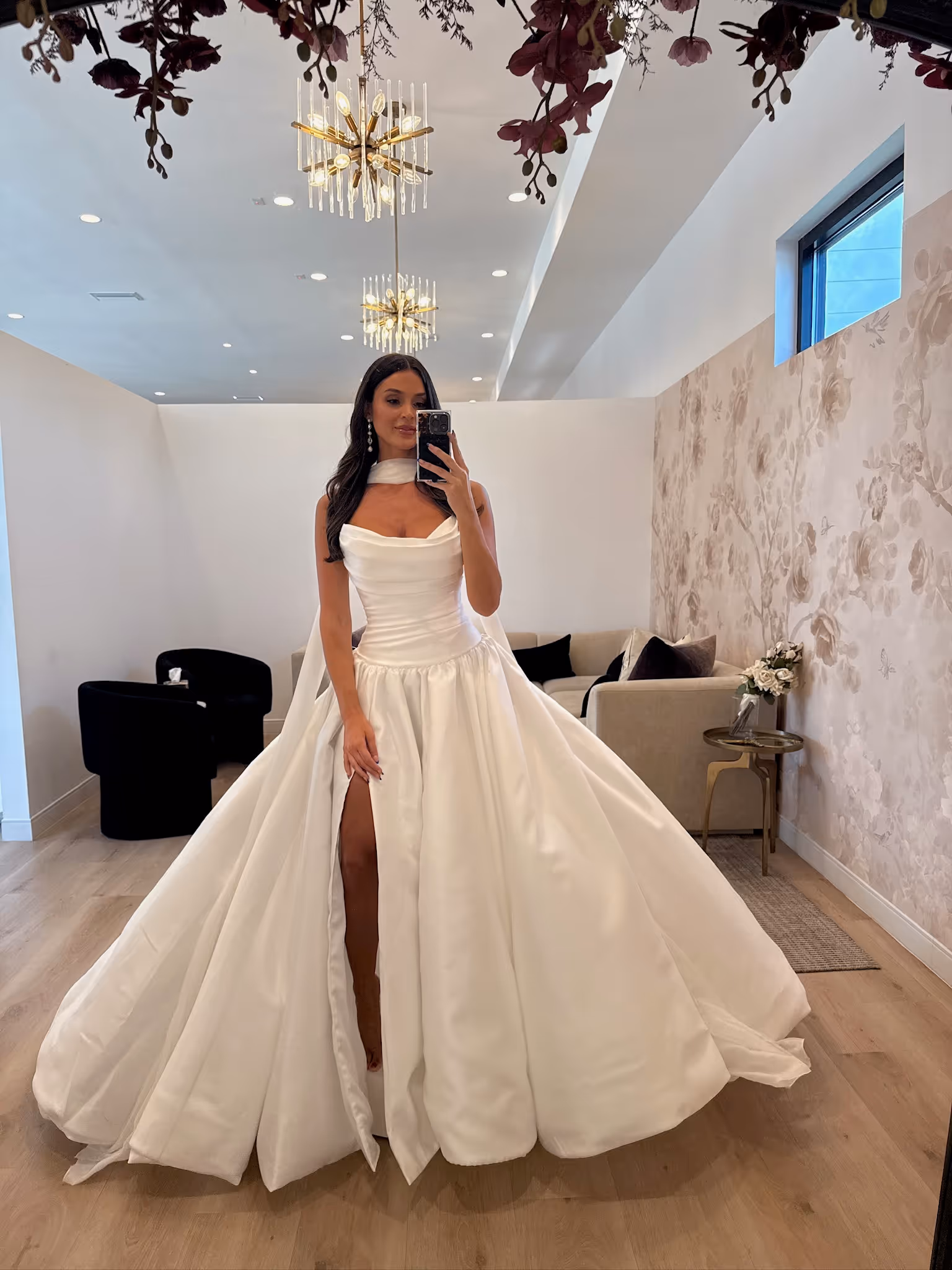 Step into high-fashion elegance with the Natalia gown. Featuring a sleek ballgown silhouette with a contemporary drop waist, this gown effortlessly blends modern design with dramatic flair. The voluminous ballgown skirt creates a striking, statement-making presence, perfect for the bride who wants a bold and unforgettable look. Crafted in a clean, sophisticated fabric, Natalia embodies modern romance with a couture edge. Customized just for Love, a Bridal Boutique!