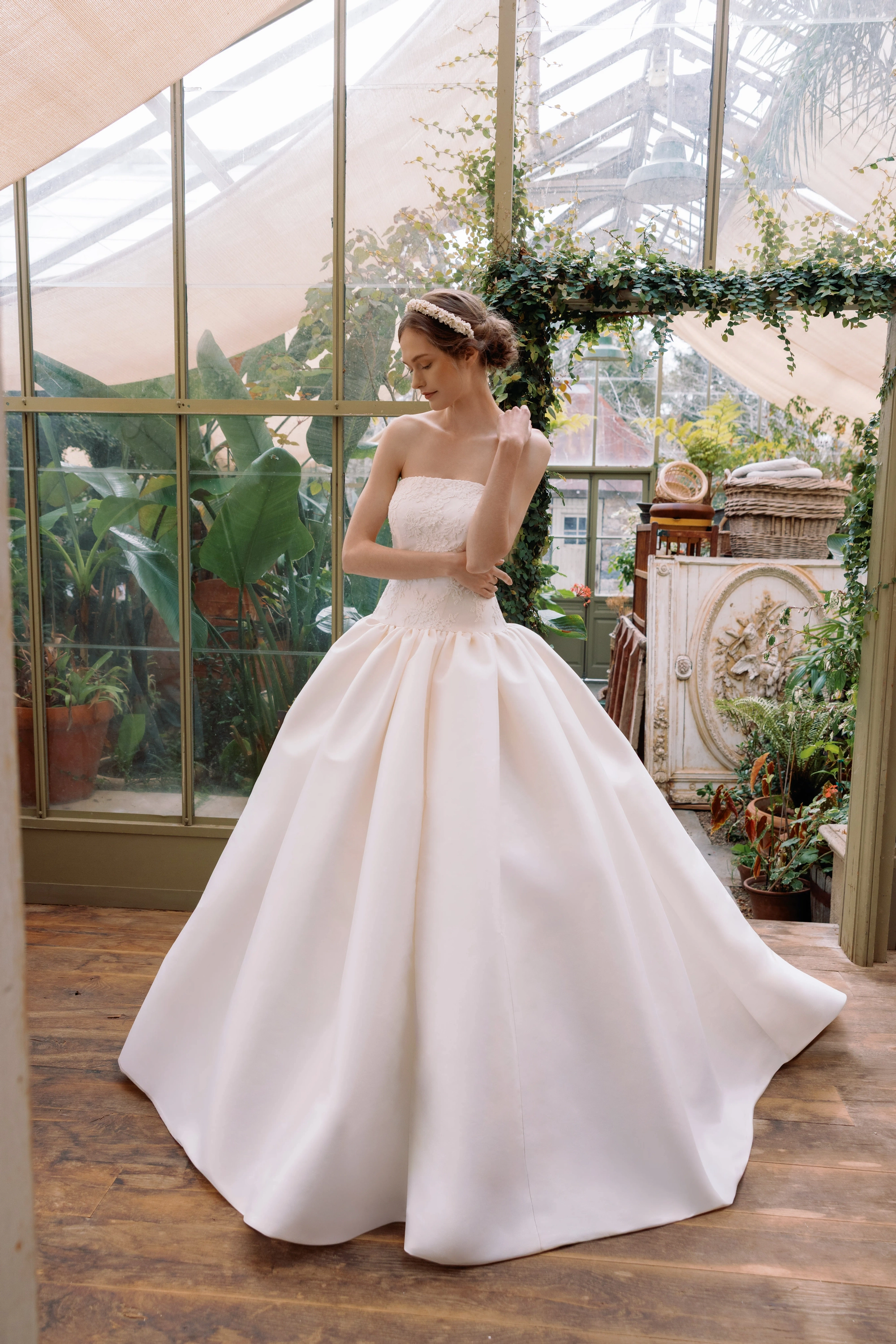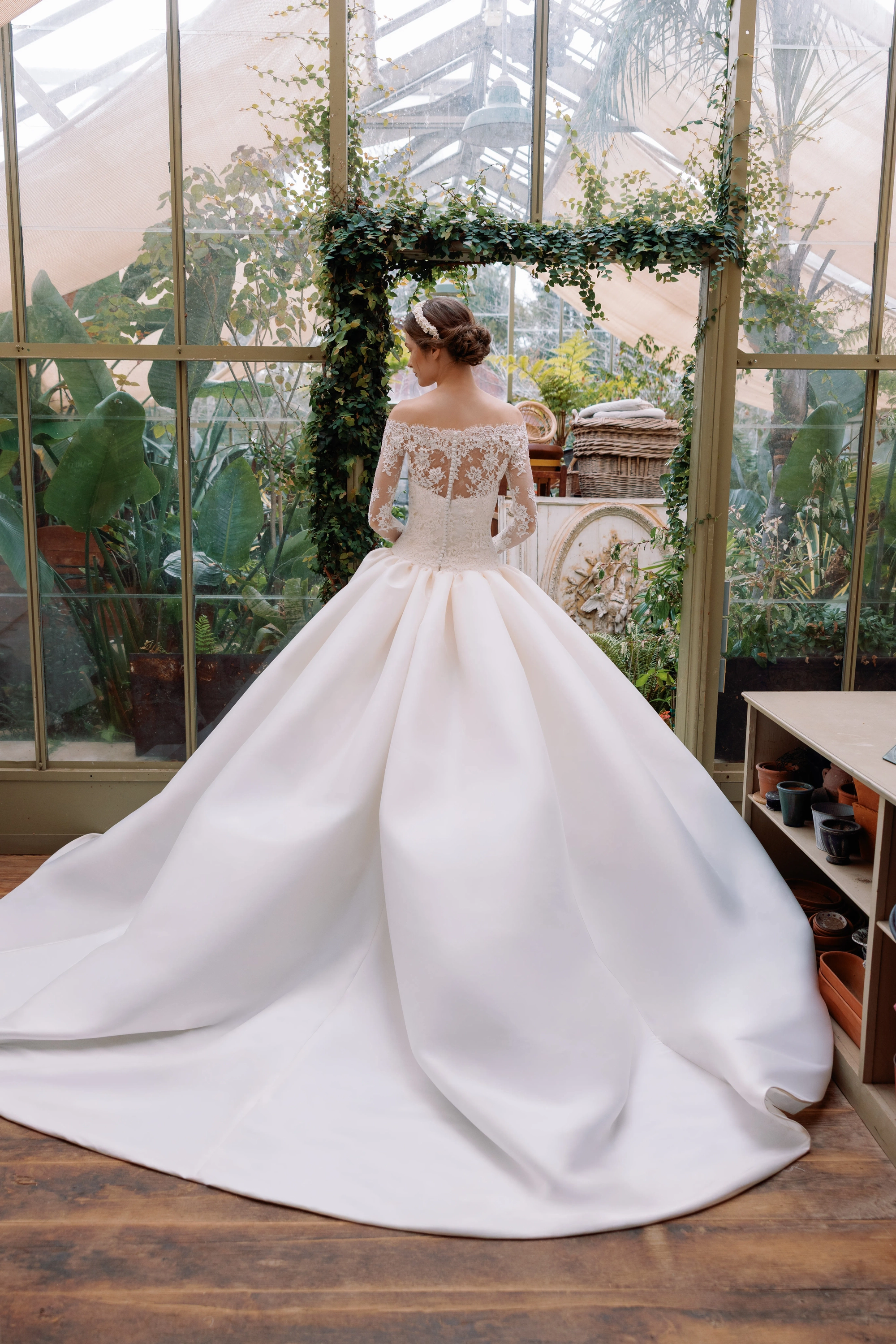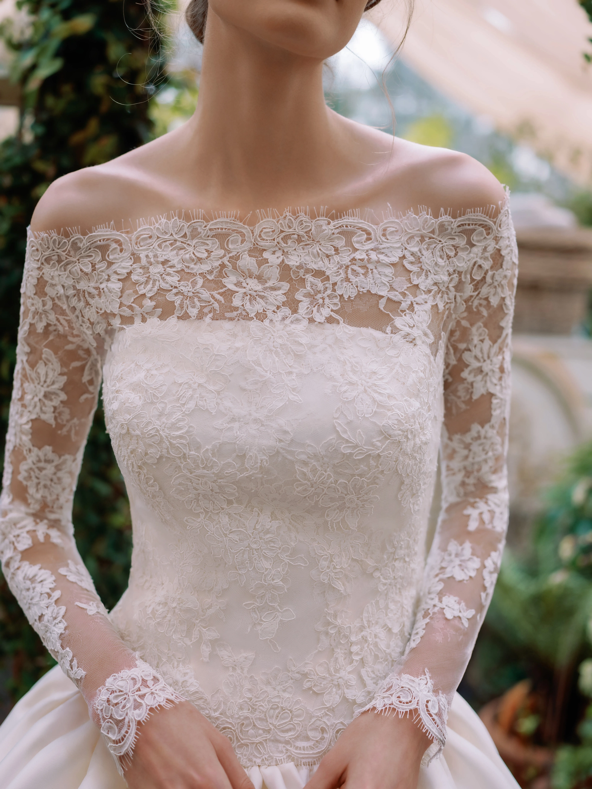The epitome of class and elegance! Alençon lace with Chantilly underlay gown featuring a straight-edge neckline and a dramatic drop-waist ballgown silhouette, crafted from Italian Stretch Mikado with a gathered skirt and cathedral-length train. The long sleeve, off shoulder bolero is removable for a two in one look. Incredible fit, timeless silhouette, and a dress that stands the test of time.
