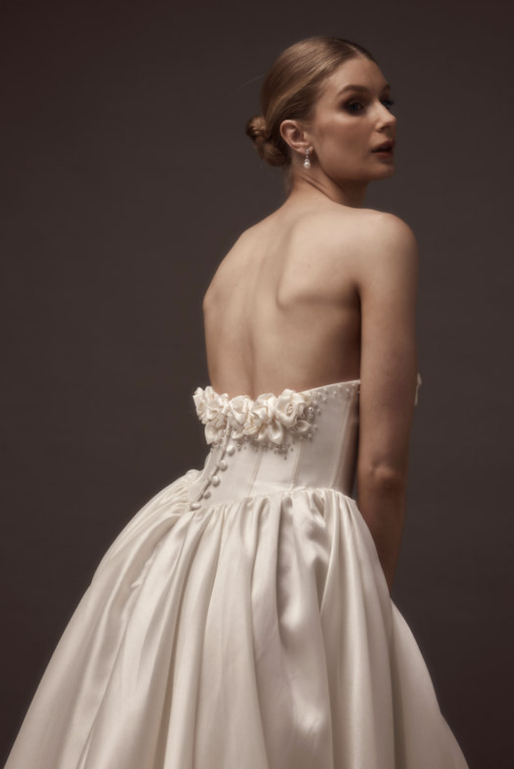 Phoebe is decorated with small pearls and rosettes inspired by the '80s. The tapered corset-style bodice has 12 pieces of boning giving it the ultimate structure and support showing off the natural curve of the waist. The mikado satin bodice transitions into the full skirt featuring a petticoat for volume and shape.