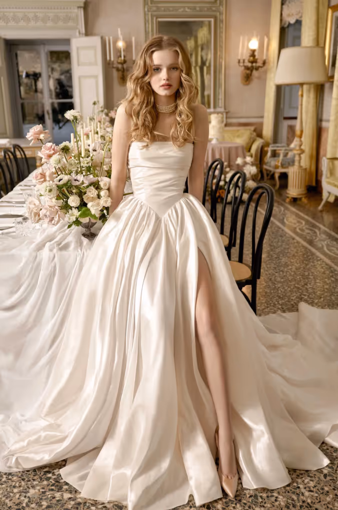 Raffaella by Flora is a sophisticated strapless wedding gown featuring a graceful A-line skirt that exudes effortless elegance. Crafted from the finest taffeta, it offers beautiful movement, flow, and a subtle sheen, creating a timeless and stunning bridal look. Its clean lines and classic silhouette make it perfect for the bride who values both simplicity and refined style.