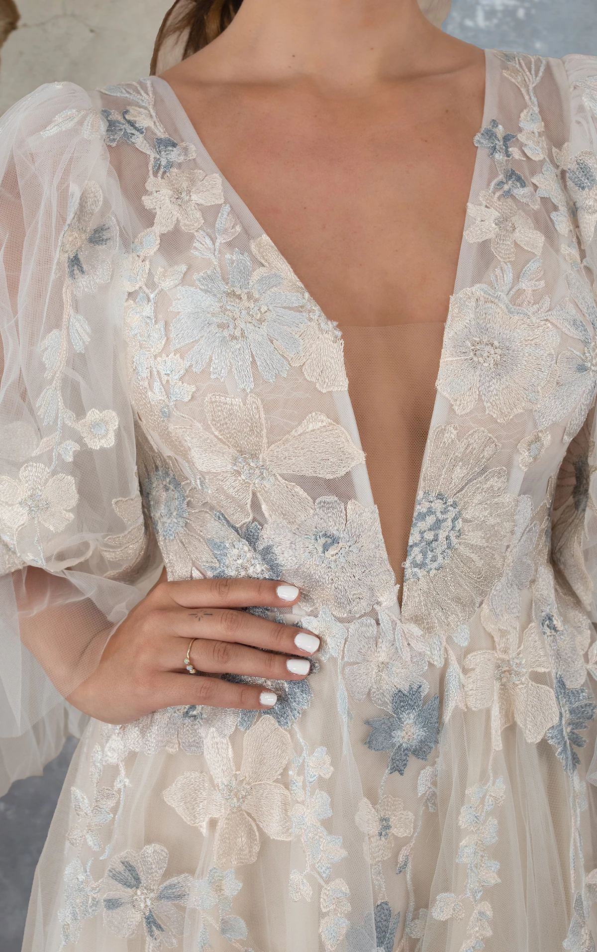 This boho wedding dress has it all — from the statement long sleeves to the ethereal florals, it’s made for the bride who wants to blossom on their big day. Sheer blouson sleeves attach from the bodice, where a deep V-neckline extends to the waistline. Mirroring the front, a deep V-back detail adds that extra touch of sexy. The sheer matte lace covers this stunning A-line bridal gown, while delicate floral accents cascade down the skirt to create a beautiful botanical allure.