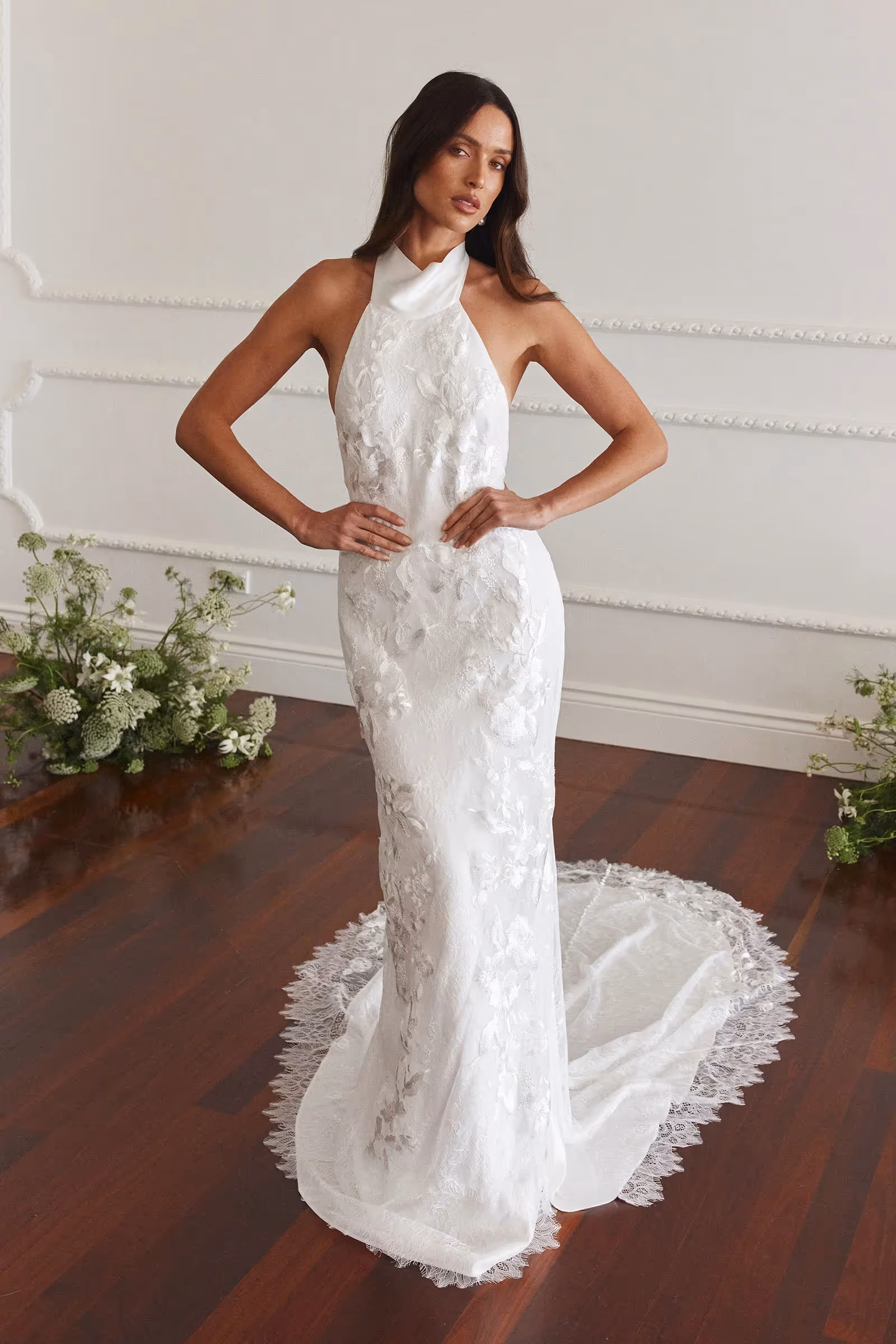 Stevie by Grace Loves Lace is as authentic as the love it celebrates. This gown combines delicate Chantilly lace with intricate hand-appliquéd embroidery, culminating in a confident high neckline that reflects both character and creativity. Perfect for the bride seeking a unique, artistic, and timeless bridal look.