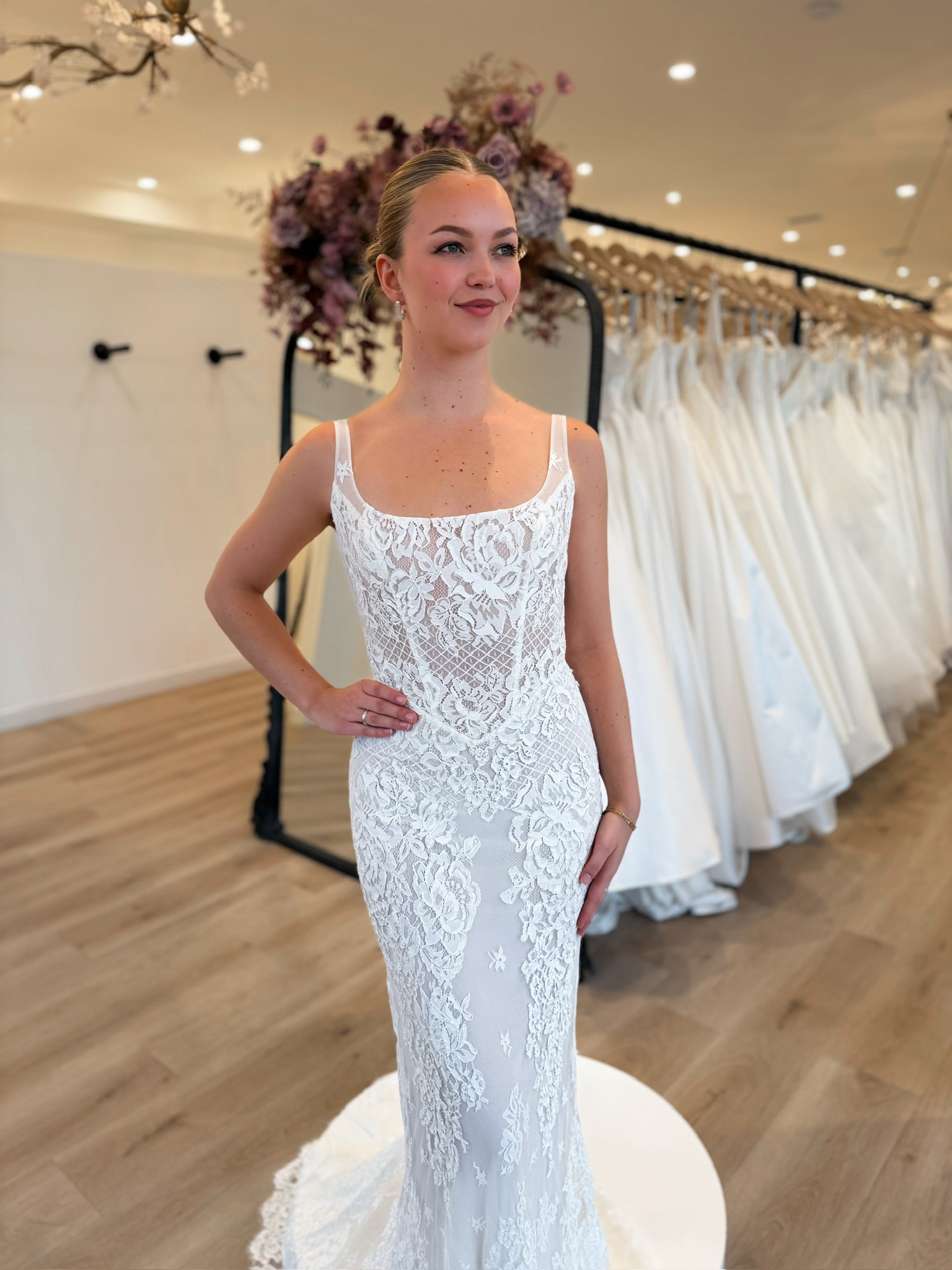 Basque waist, unique lace, delicate square neckline, unapologetically sensual. Teresa features a gorgeous low-back, a signature FLORA detail, made for the modern bride. Slightly sheer to create dimension and available to be lined for a more modest look.
