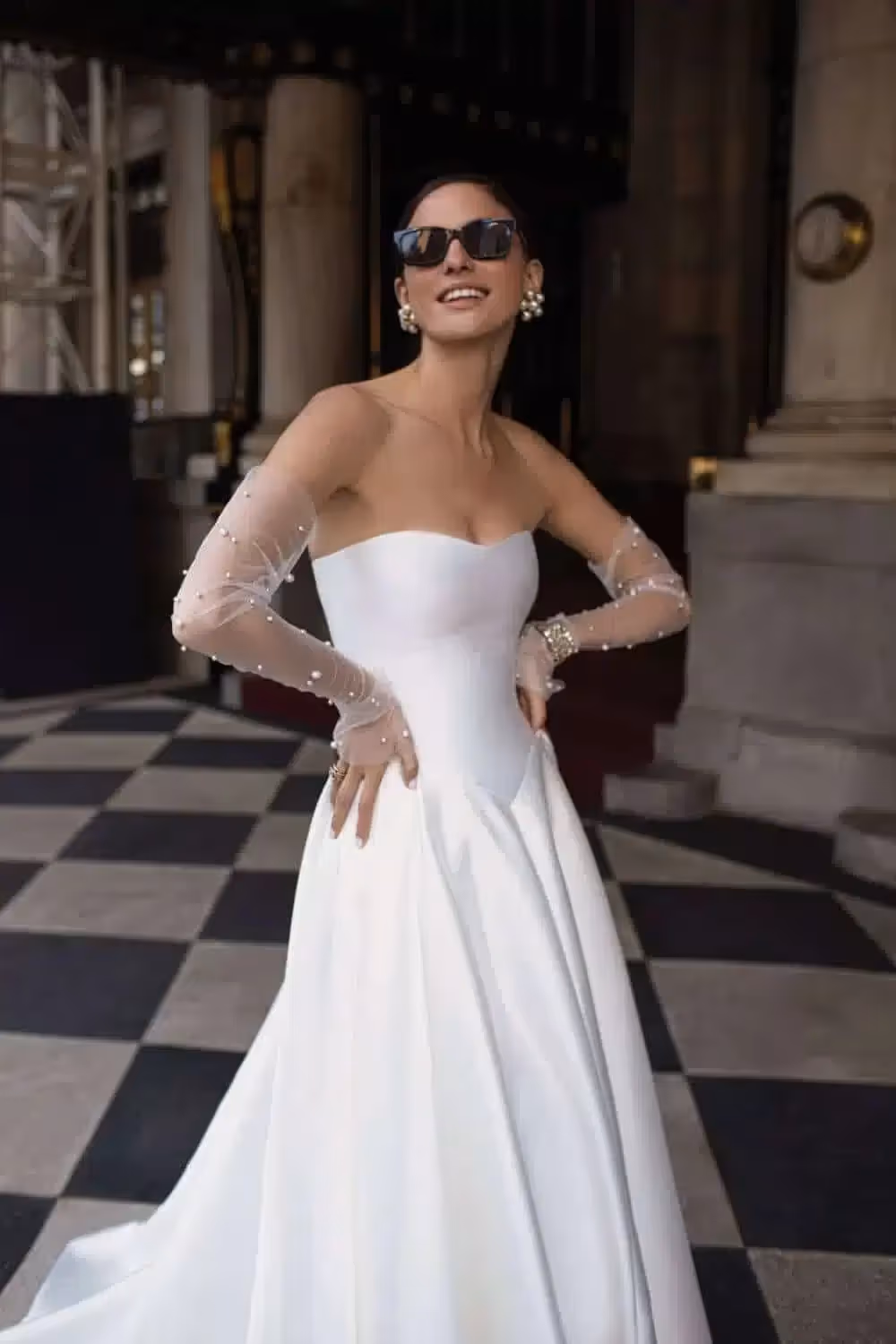 Valentina by Flora is a strapless silk A-line wedding gown that exudes timeless elegance with a modern twist. It features a chic Basque waist and a sweetheart neckline that gracefully flows into a soft, flowing skirt. Vintage-inspired buttons trail along the back to the waistline, adding delicate detail to the clean, minimalist silhouette—perfect for the bride seeking understated sophistication and effortless style.