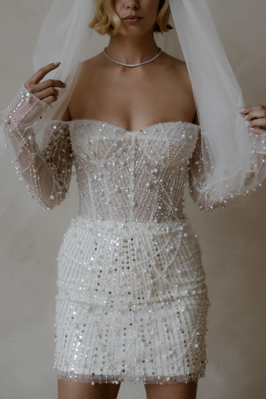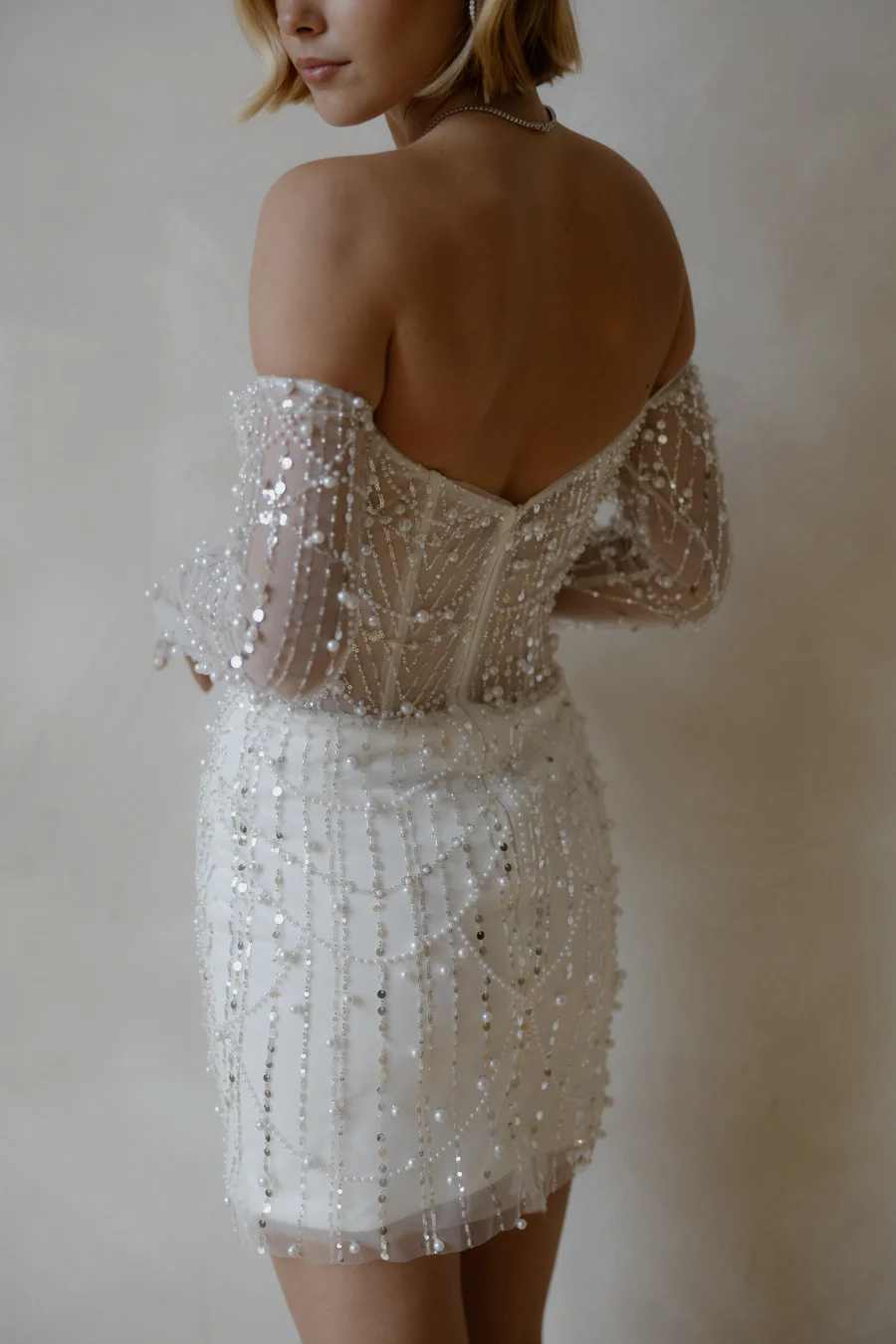 Where quiet luxury meets hot girl summer. The sparkling sister to the Madeline dress by Untamed Petals, this new icon is designed for the bride who wants to sparkle long all night long. With its sleek silhouette and intricate beading, the Amalfi Mini is perfect for rehearsal dinners, bachelorette nights, or the after party. Pair it with strappy heels and a glass of champagne because in this dress, every moment feels like golden hour.