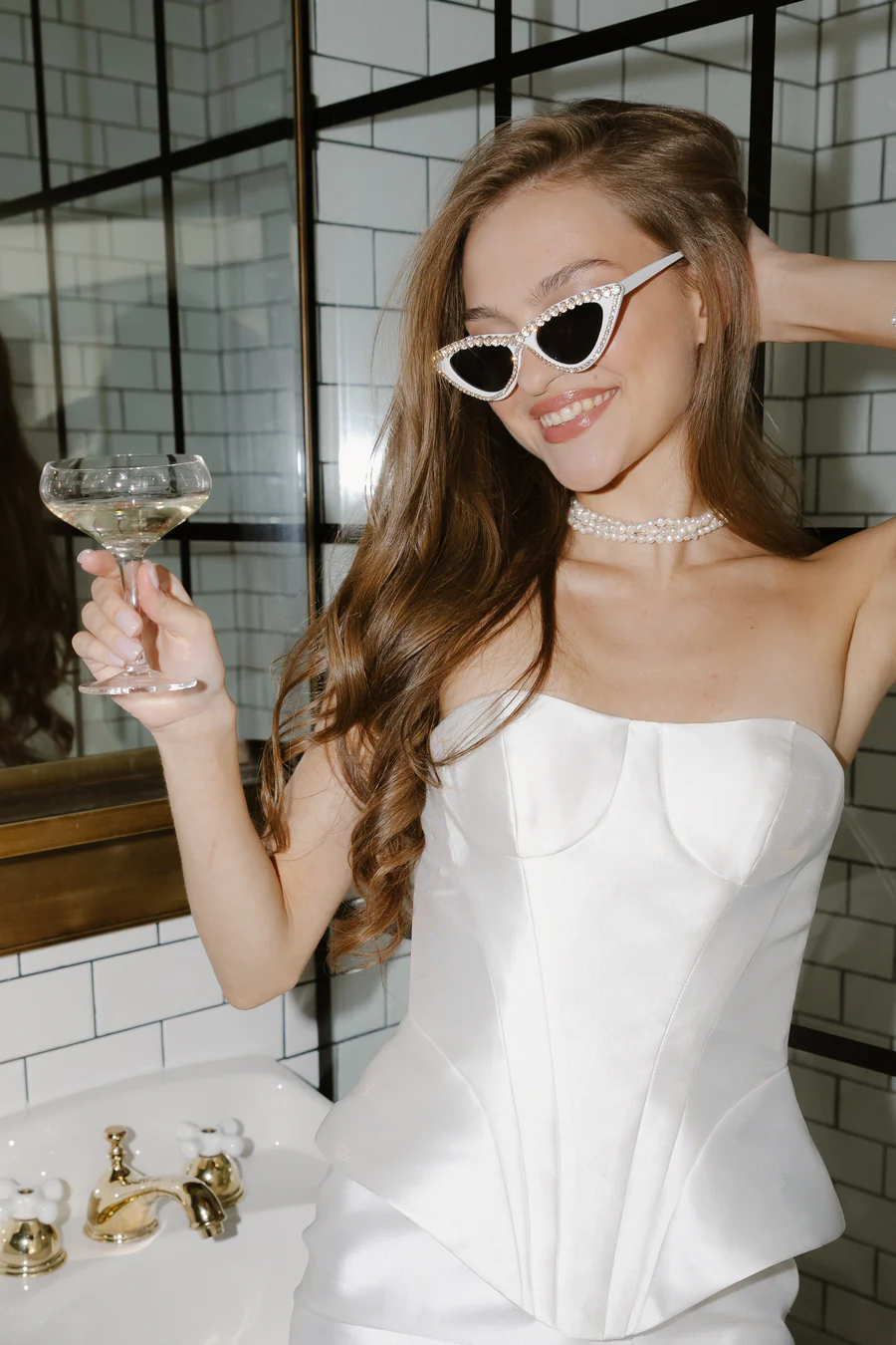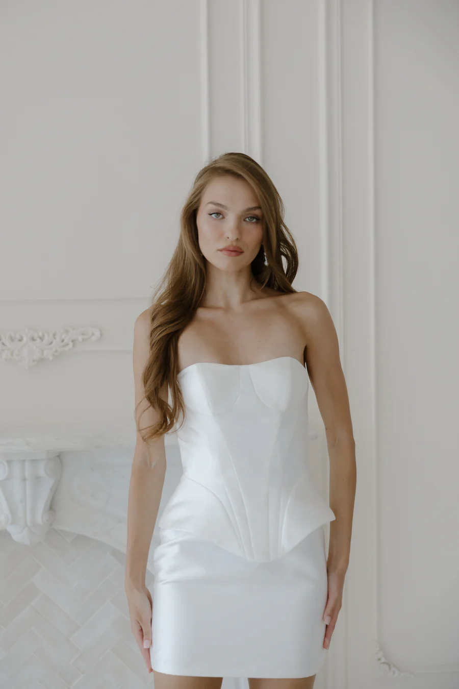 Structured, striking, and undeniably cool. Celeste by Untamed Petals is a sculptural mini made for the modern bride. Featuring a strapless corset bodice with flattering paneled boning and exaggerated hip detailing that creates a bold, feminine silhouette. Style it solo for a sleek statement or pair it with gloves, a neck scarf, or jacket for instant cool bride energy. Back zip closure.